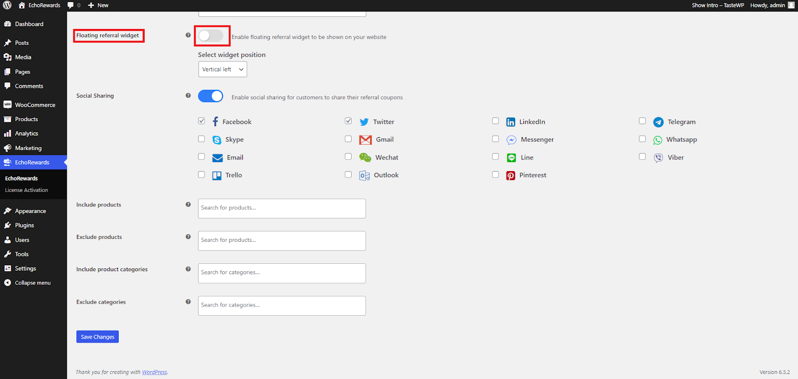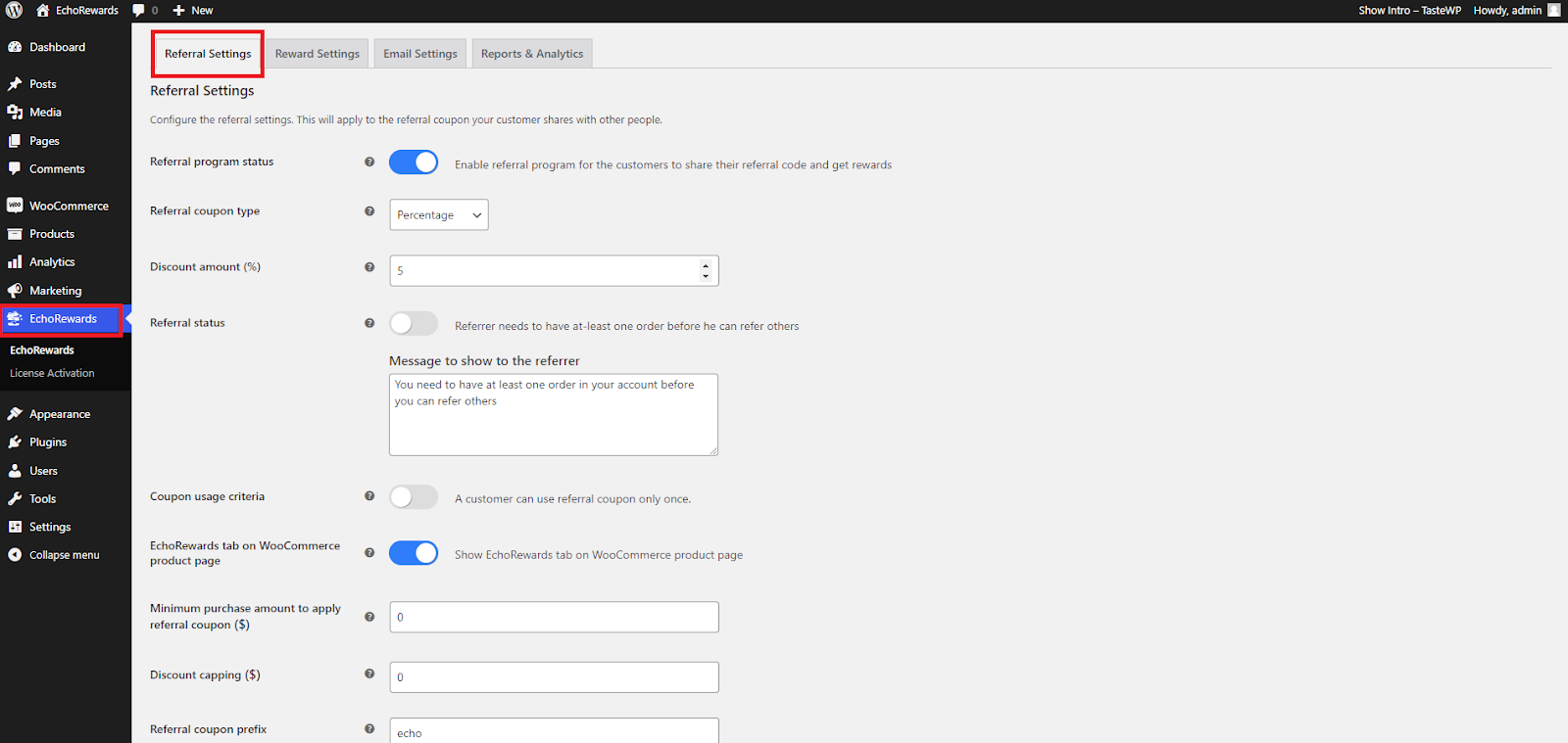 To start, go to your WordPress Dashboard > EchoRewards > Referral Settings.