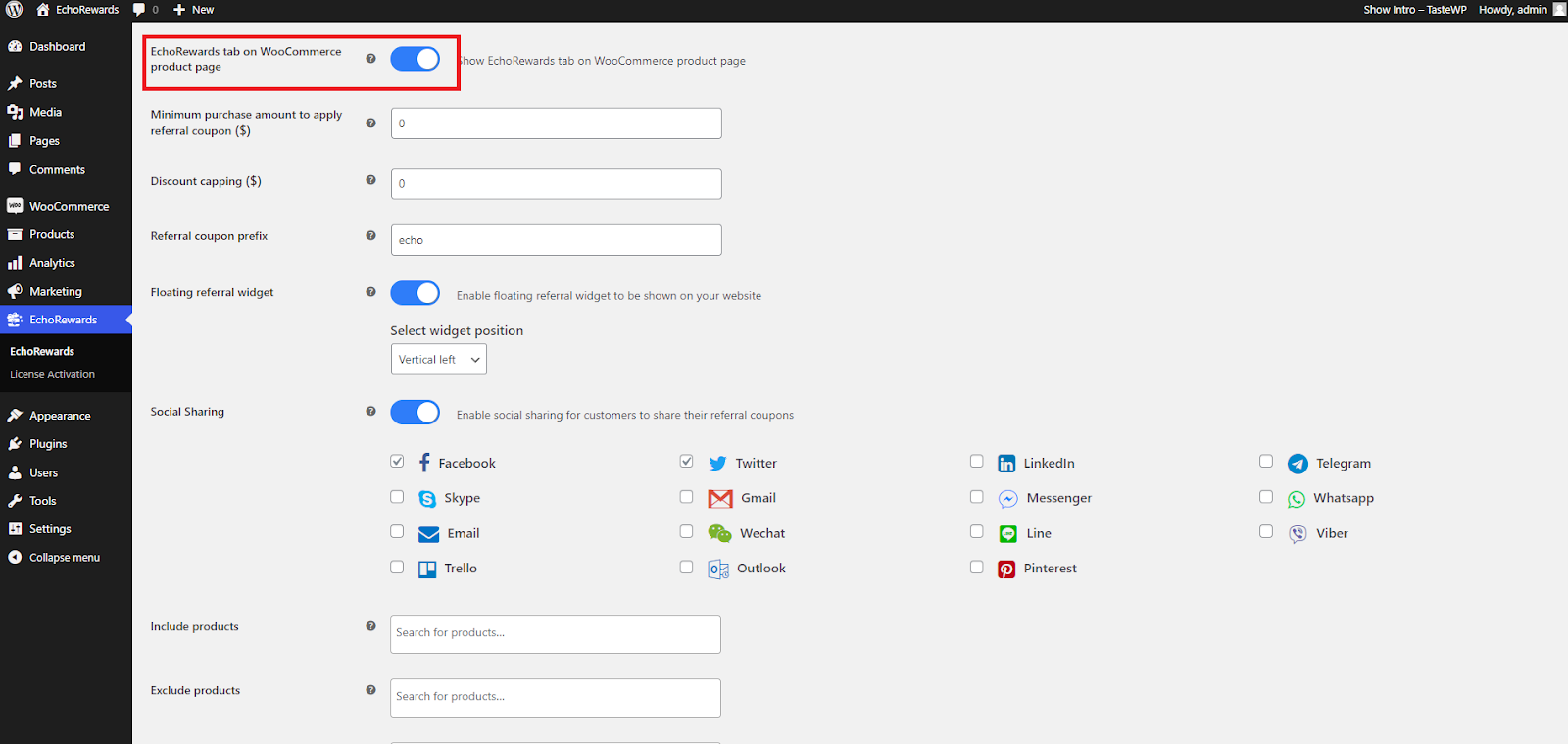 Then look for the “EchoRewards tab on the WooCommerce product page” option and enable/disable it.