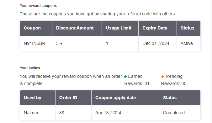 When someone applies a referral coupon, he and the referring friend get a reward.