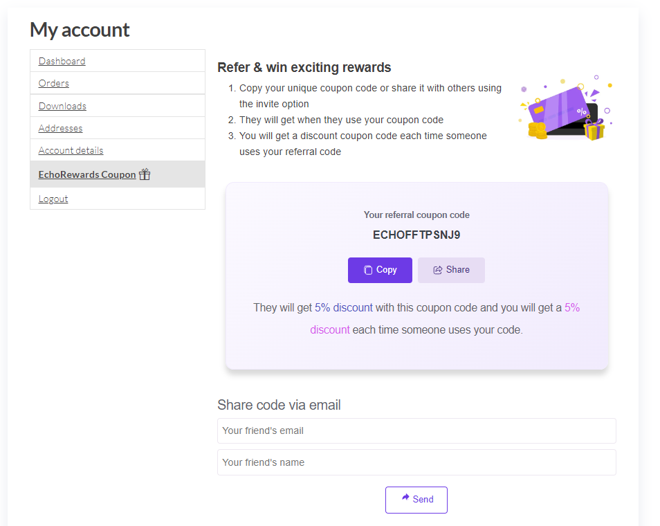 Customers can share referral coupons from their account page. They will find a menu for EchoRewards with a unique coupon code.